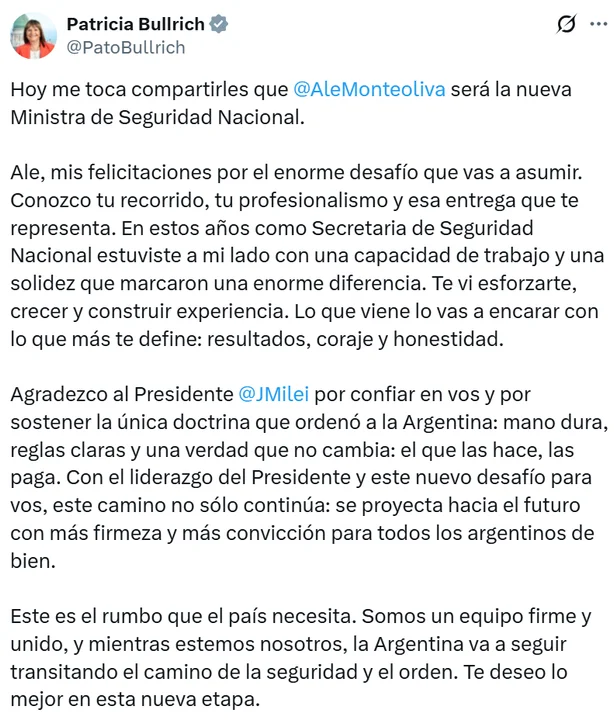 “La Oficina del Presidente informa que que la actual Secretaria de Seguridad, Alejandra Monteoliva, será la nueva ministra de Seguridad Nacional”, detalla el comunicado oficial.