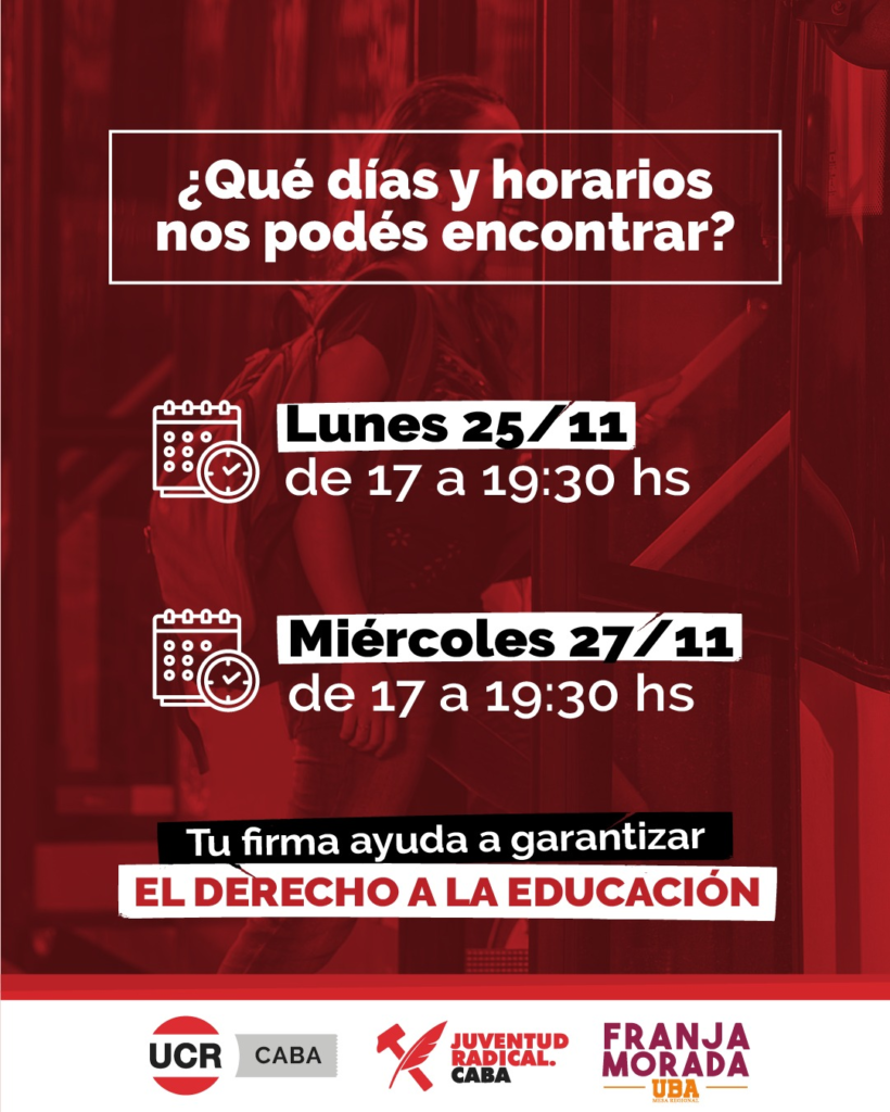 En un trabajo conjunto entre la UCR, la JR y la Franja Morada, se colocarán 50 mesas en las principales esquinas de la Ciudad para lograr un fuerte apoyo que impulse la sanción del boleto estudiantil universitario en la Legislatura porteña.