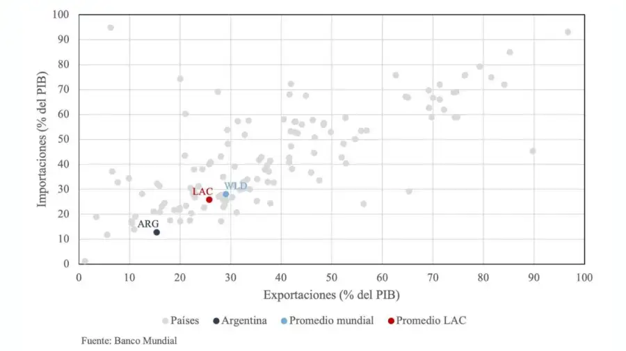 Para fundamentar su postura, el ministro adjuntó un gráfico del Banco Mundial que muestra la relación entre exportaciones e importaciones de los países en porcentaje del Producto Bruto Interno (PBI). Según explicó, el esquema indica que las economías que más importan también son las que más exportan, mientras que las que restringen el comercio suelen tener bajas exportaciones.